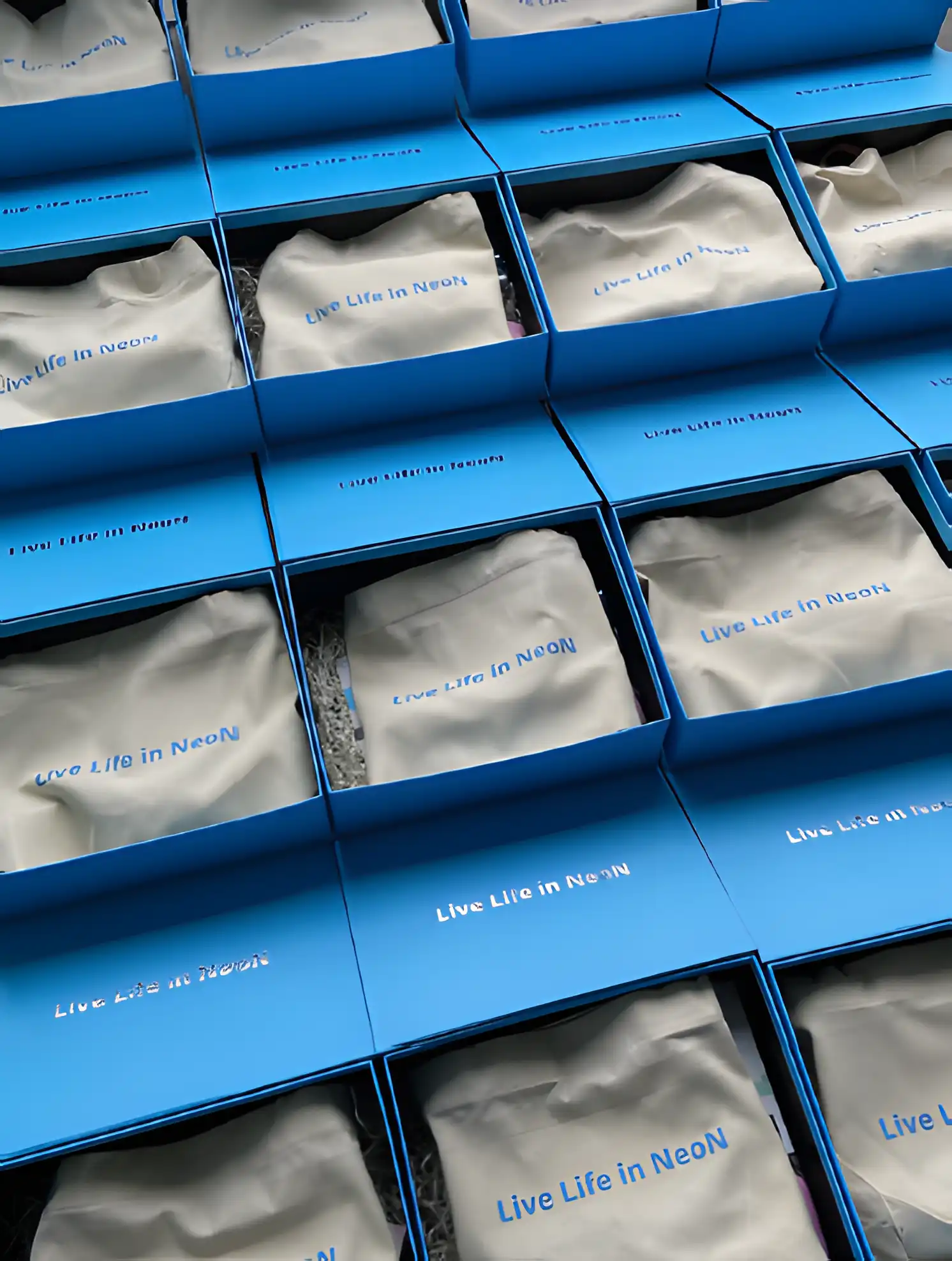 Eco-friendly canvas tote bags featuring the "Live Life in NeoN" slogan, heat-pressed for durability and style.